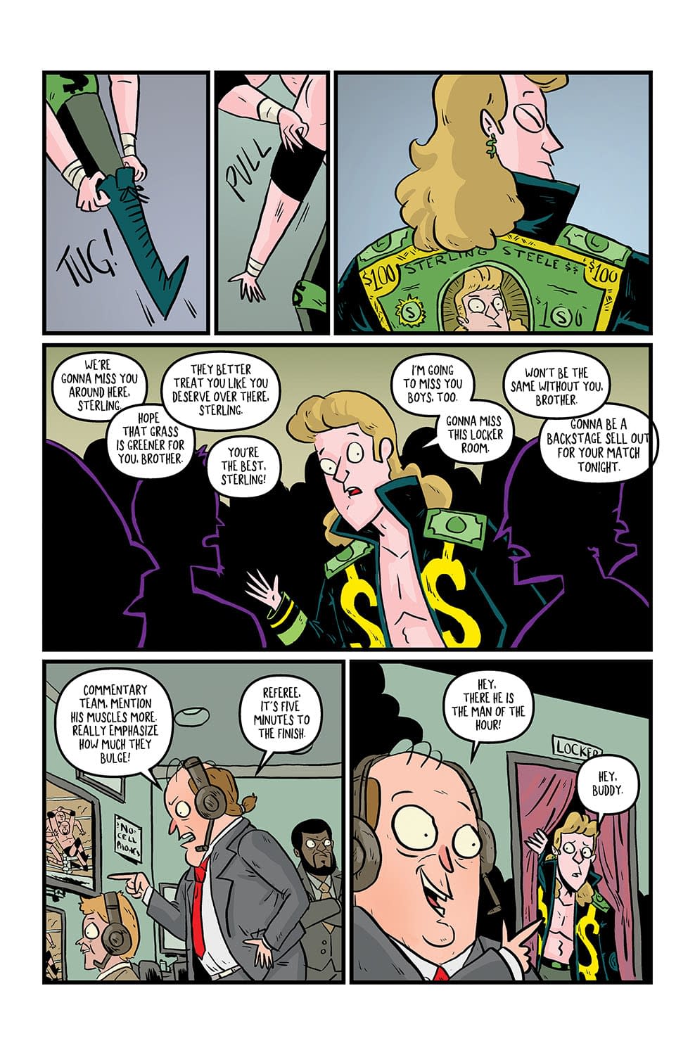 From the outrageous, action-packed mind of multi-time Eisner nominee KYLE STARKS (Peacemaker Tries Hard, Sexcastle, I Hate This Place), with eye-popping colors by VLADIMIR POPOV (Where Monsters Lie, Fearscape), comes a no-holds-barred heist caper packed with body slams and backstabs.